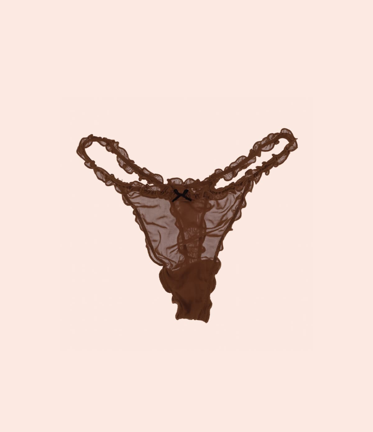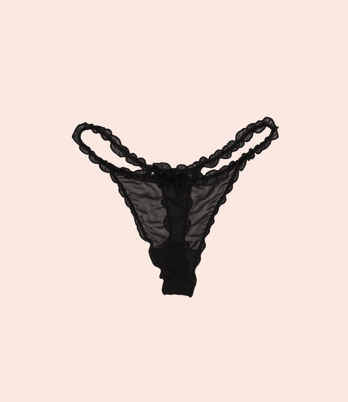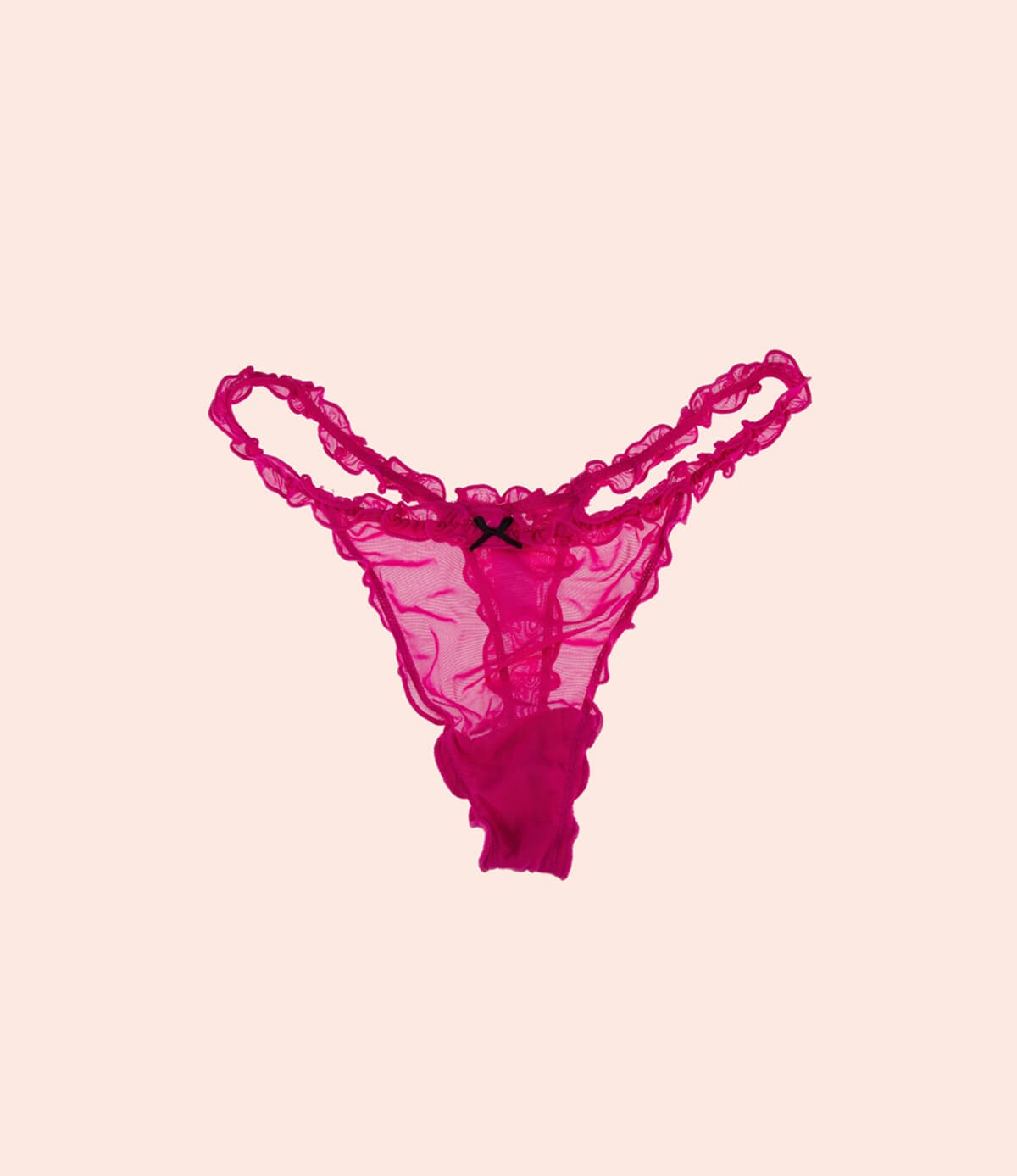 This vibrant fuchsia thong is designed with ruched sides and a flirty sheer mesh front. A tiny black bow adds charm, while the low-rise cut ensures minimal coverage. Lightweight and soft against the skin, it’s a bold and playful addition to any lingerie wardrobe.